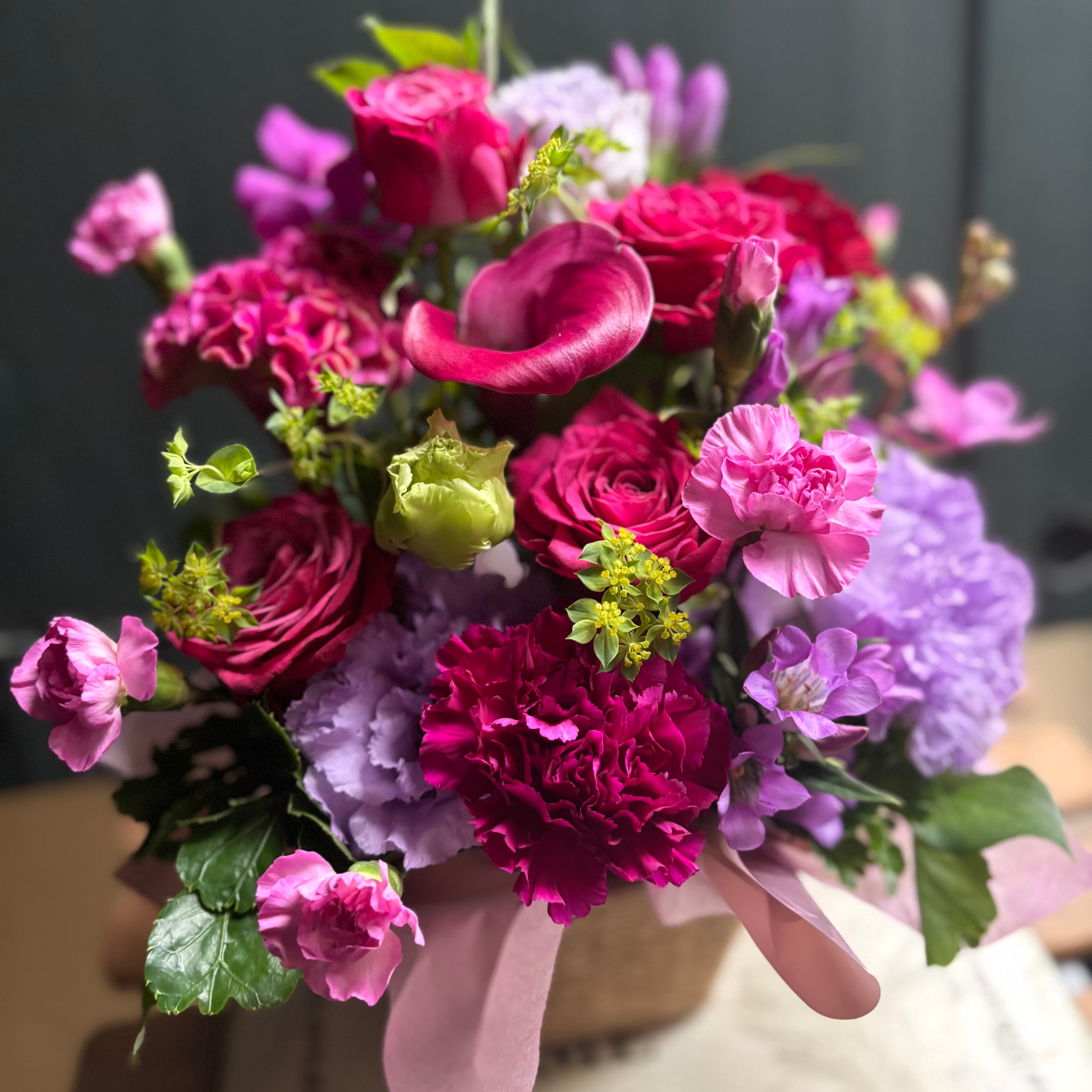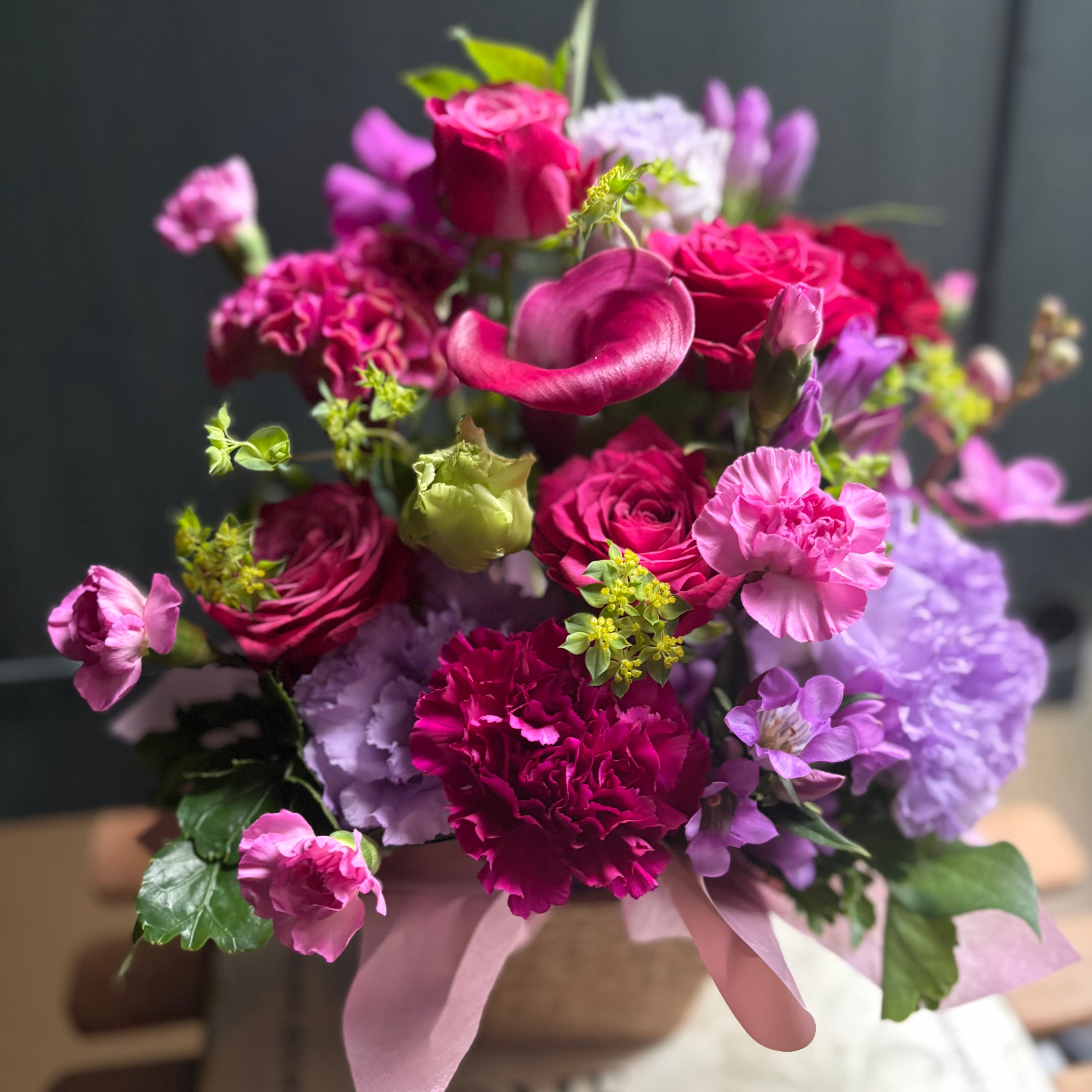 バスケットにお花をアレンジするスタイルで、お祝い等の贈りものにお勧めです。