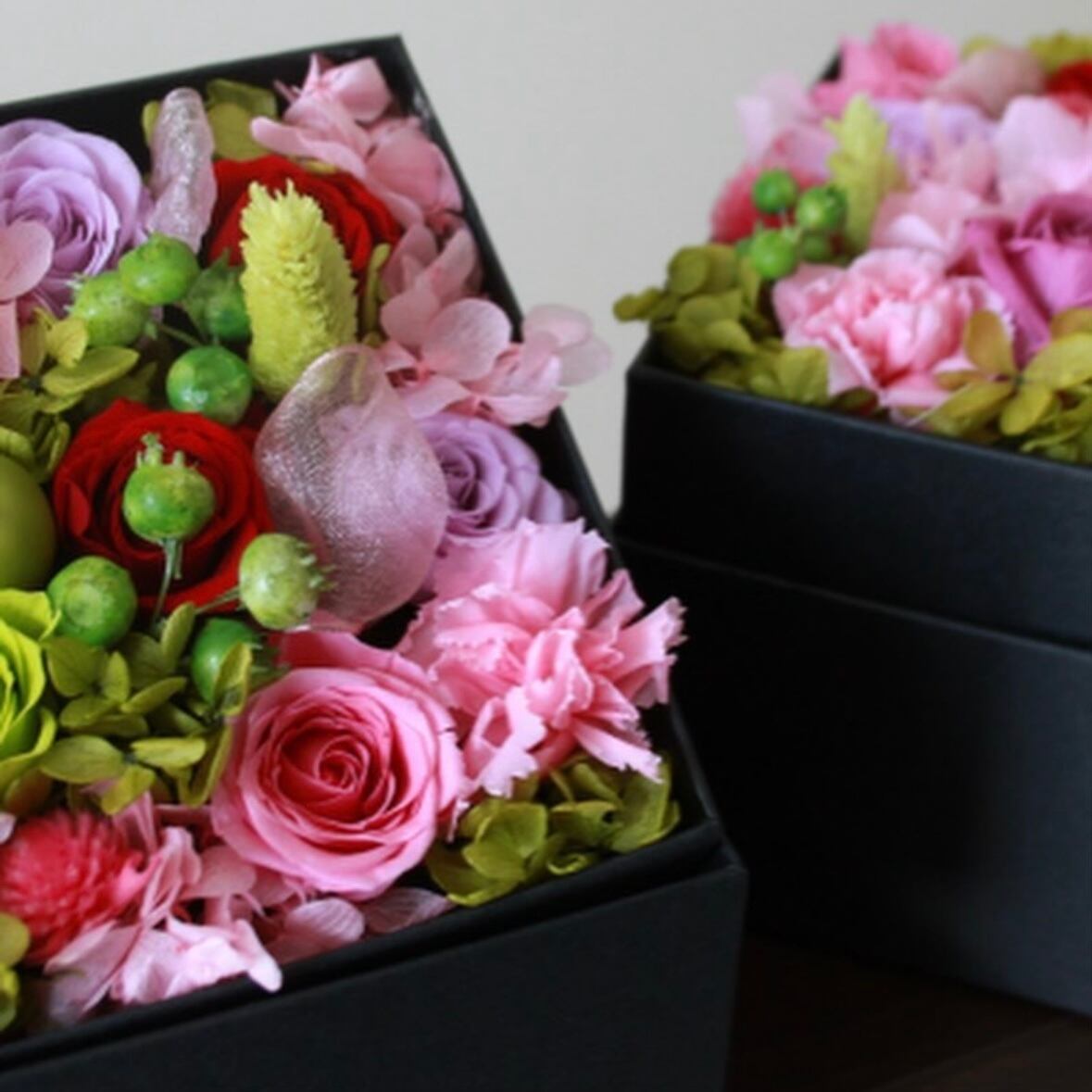 厚手の紙製の黒い蓋つきBOXに プリザーブドフラワーのバラとアジサイ等をアレンジしています。