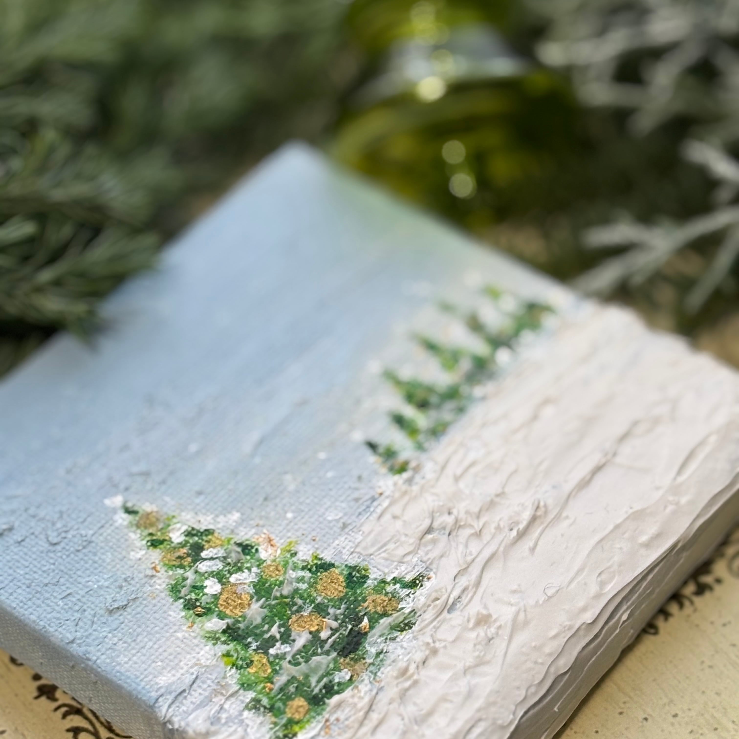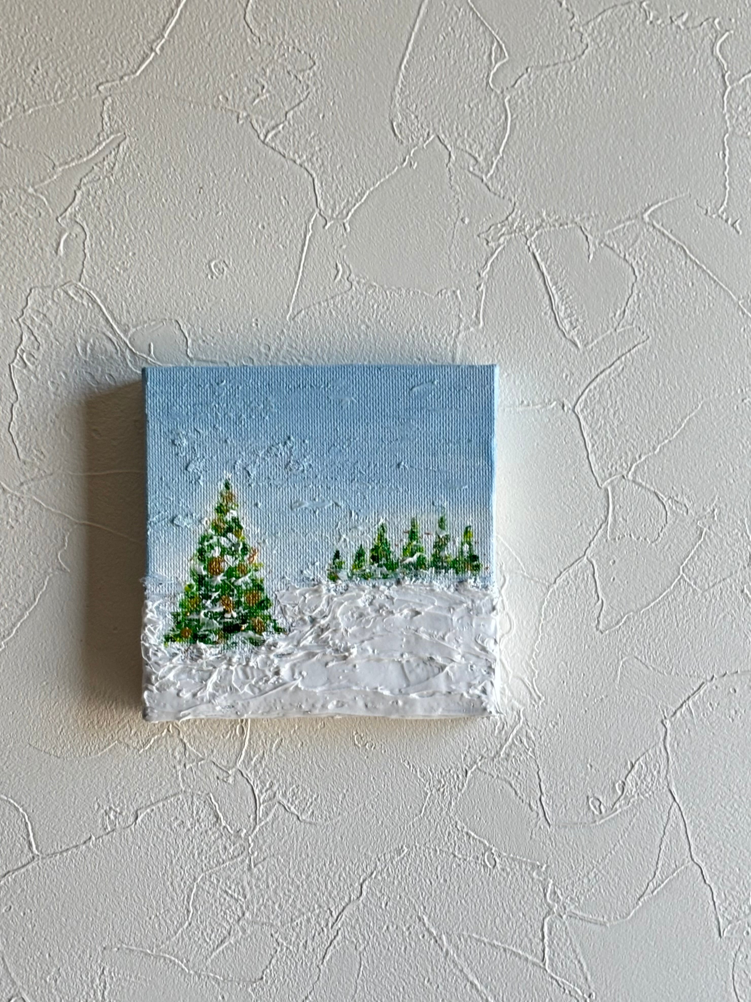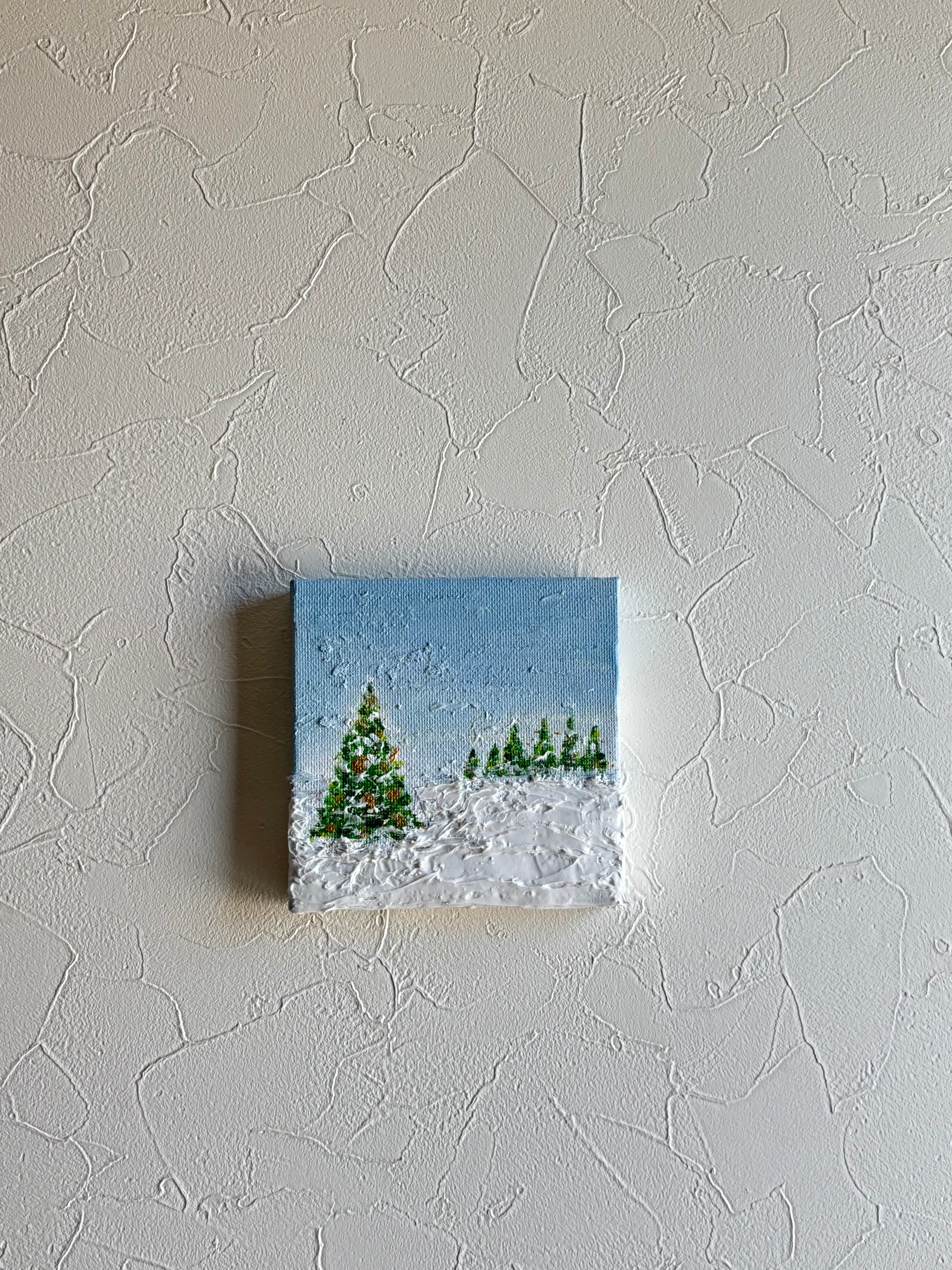 モデリングペーストとアクリル絵の具で、雪の積もる冬の森の風景を描きました。