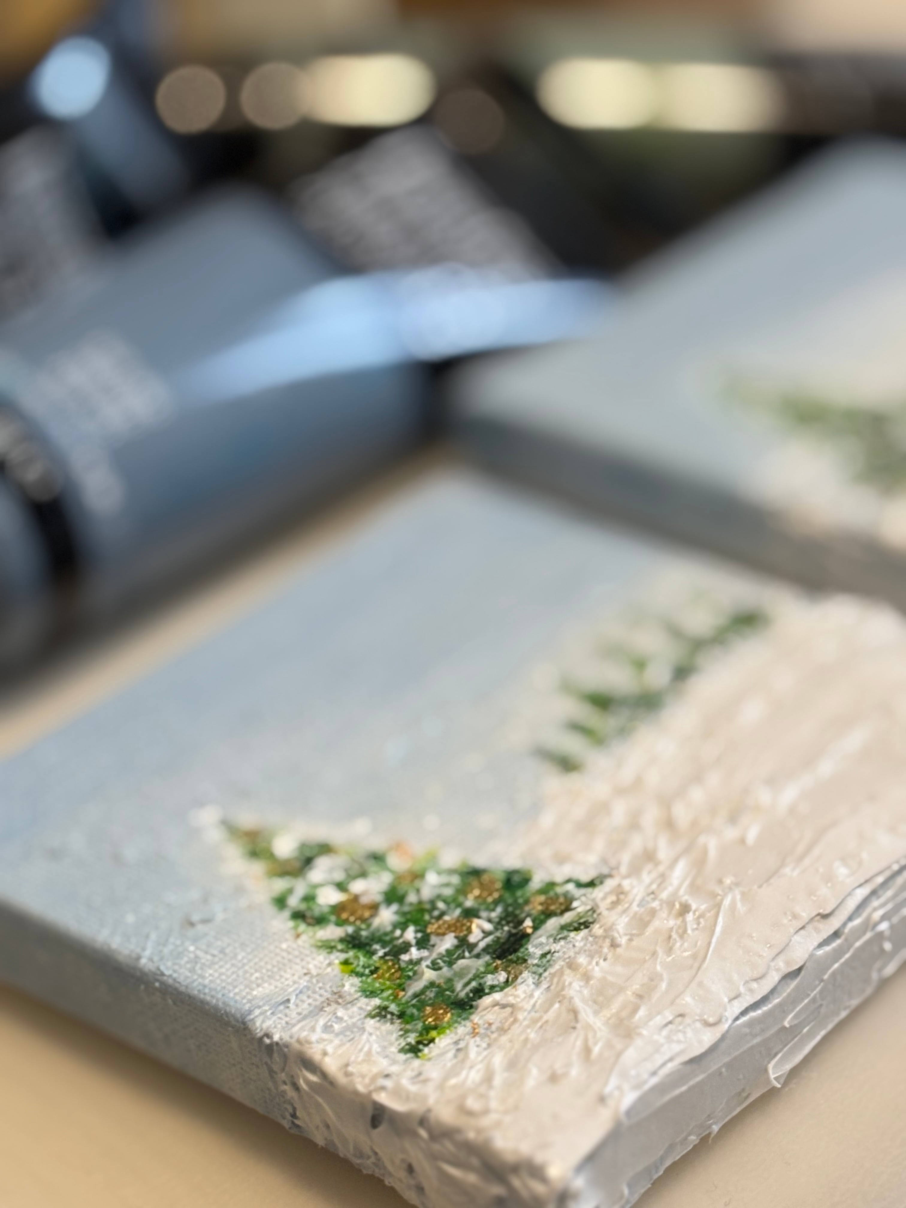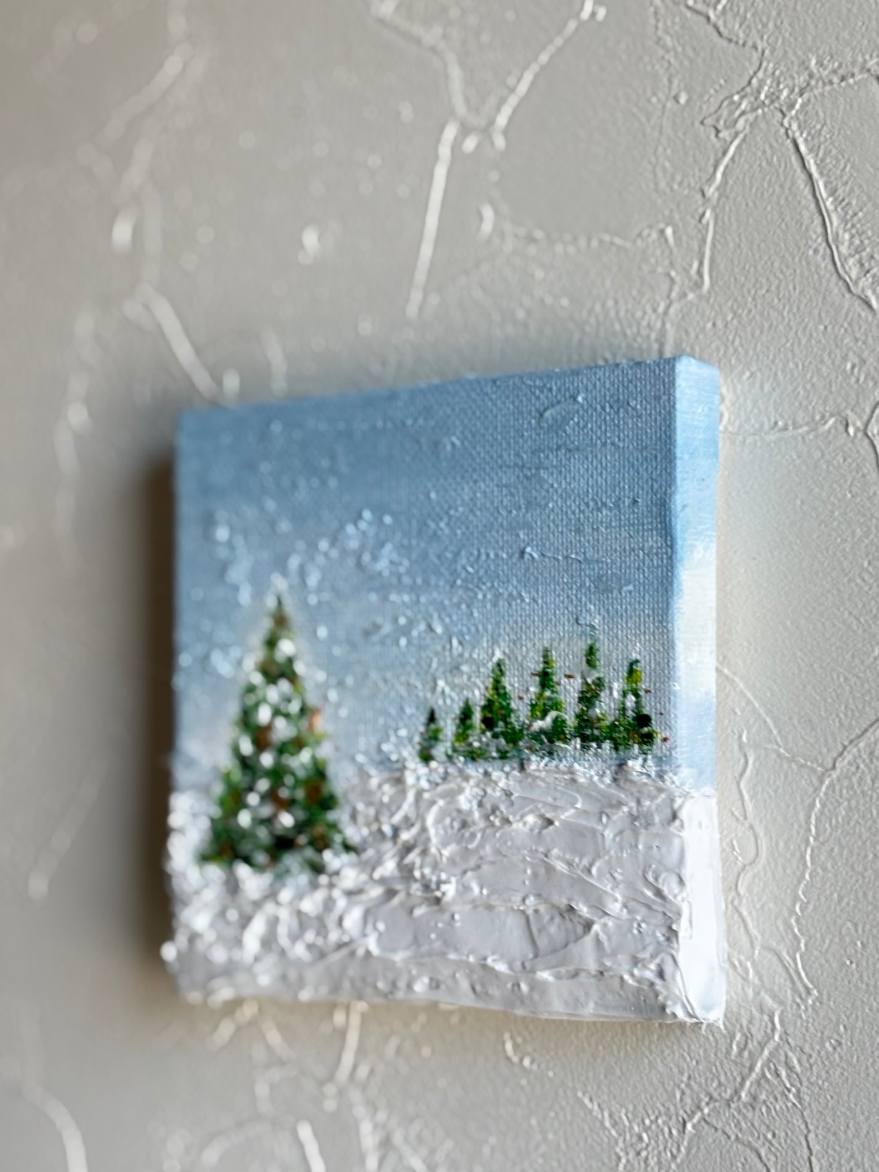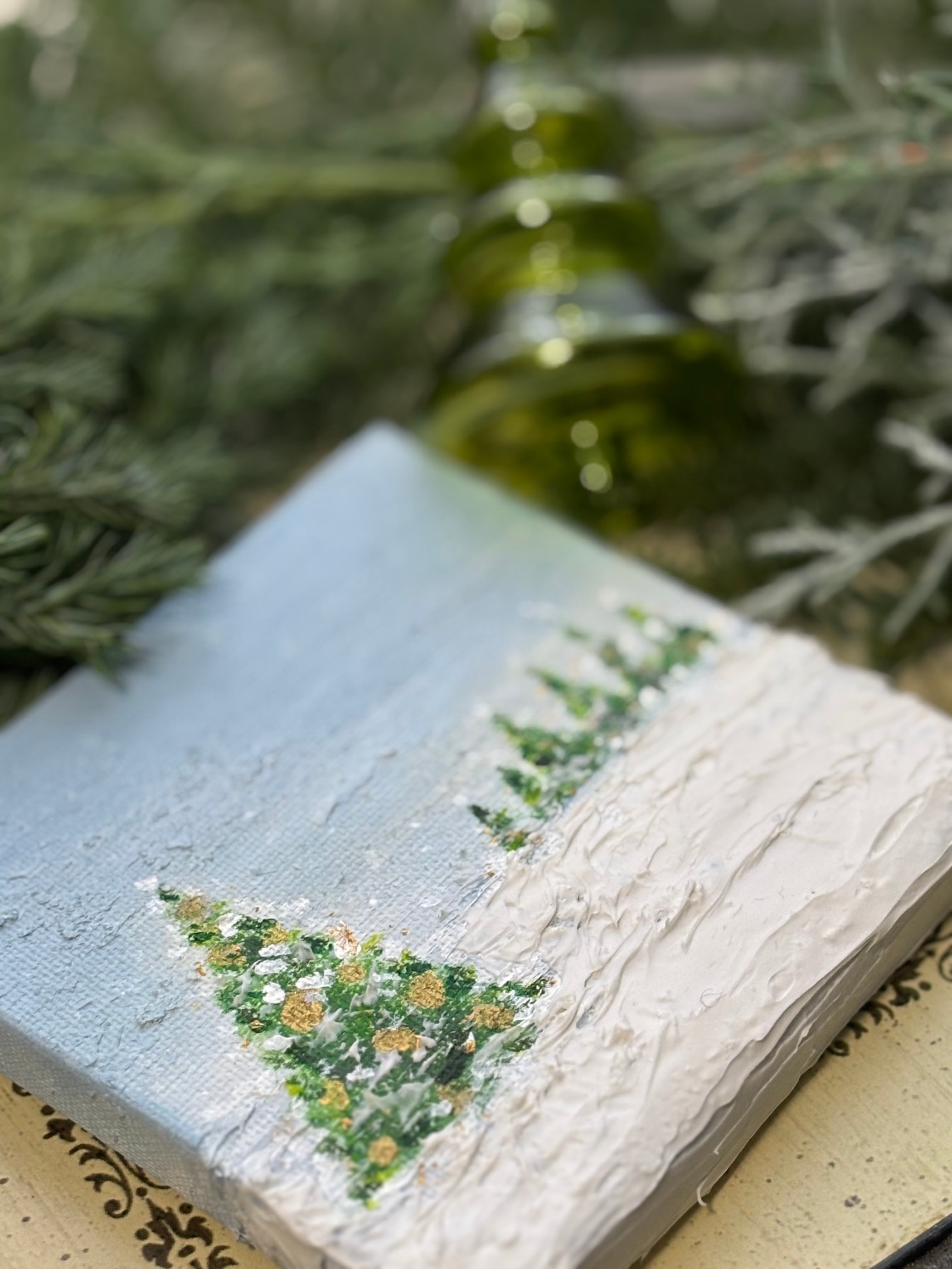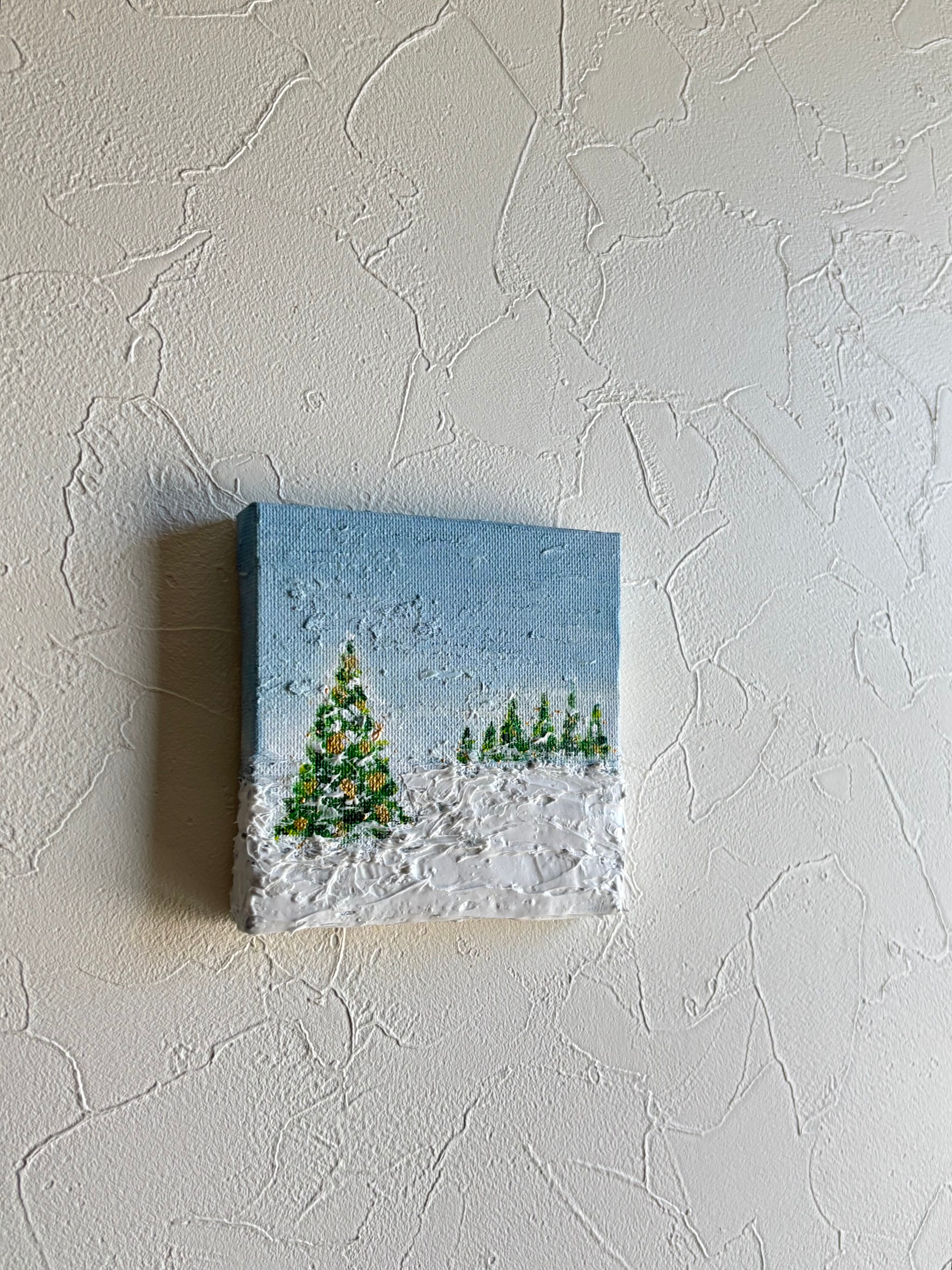 モデリングペーストとアクリル絵の具で、雪の積もる冬の森の風景を描きました。