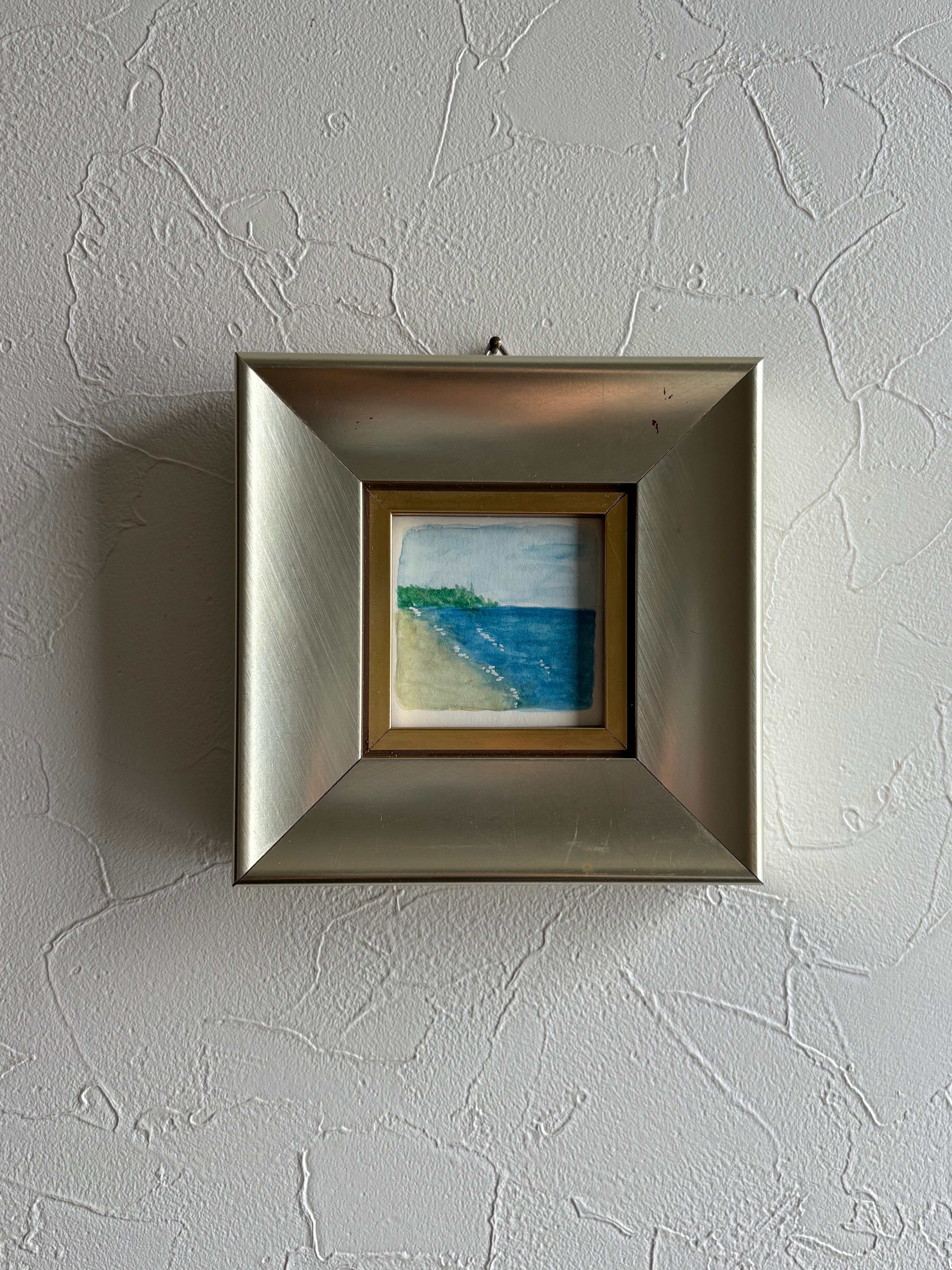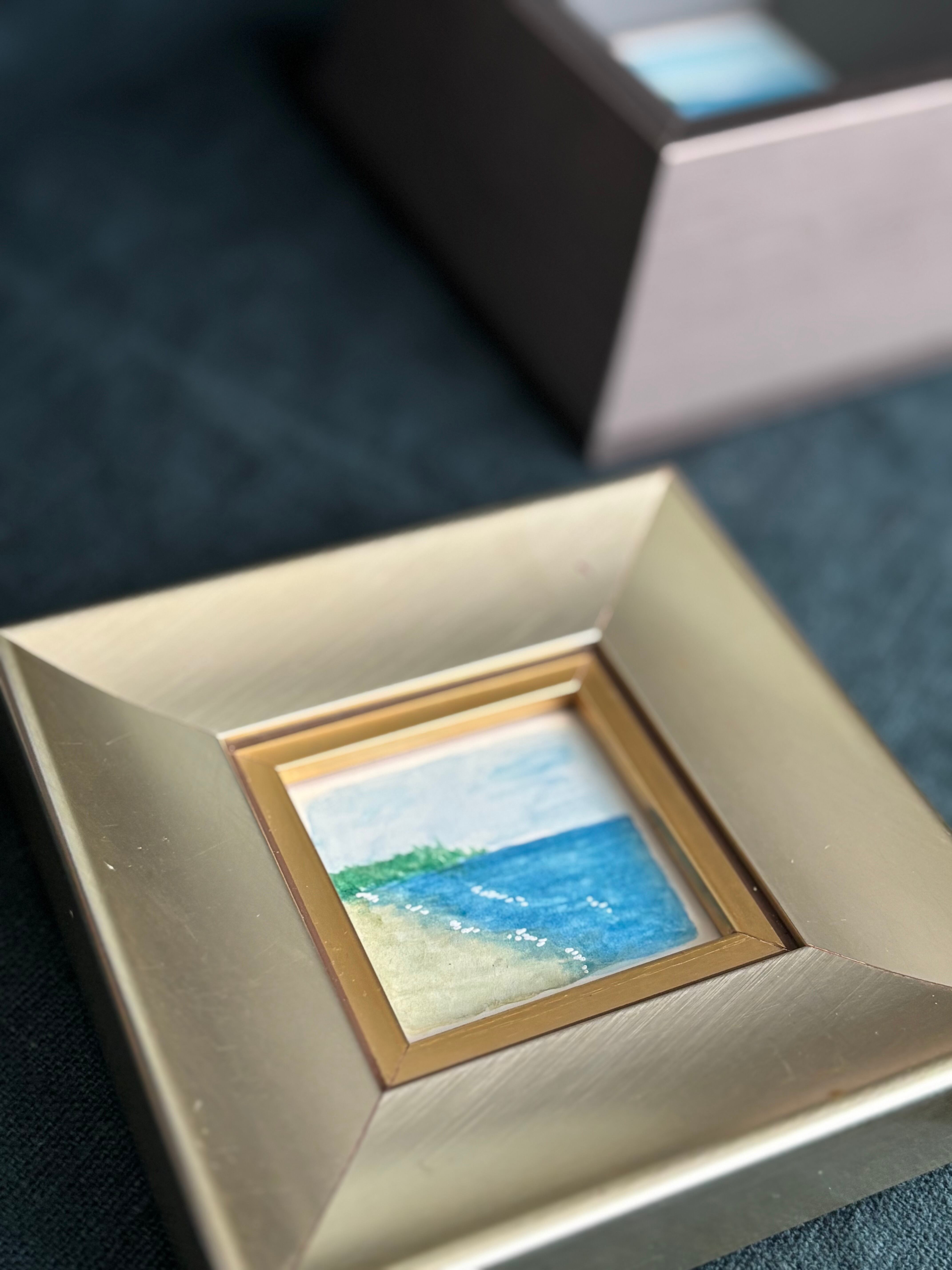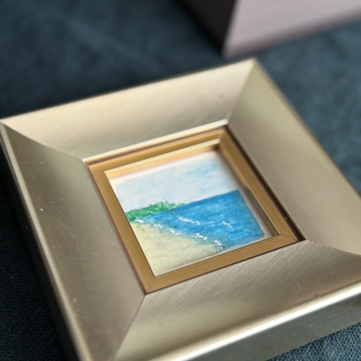 透明水彩原画~静かな朝の海~☆シャンパンゴールドカラーの木製立体フレーム