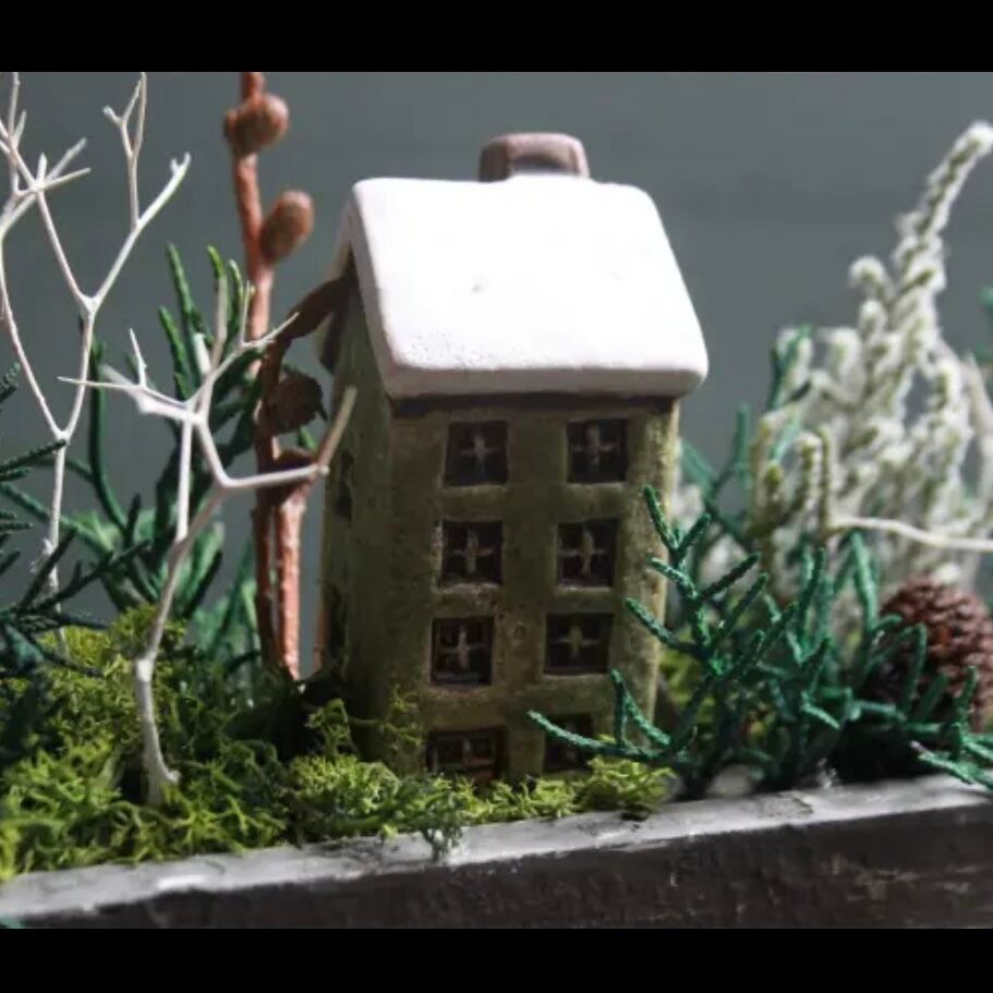 陶器の4階建てのお家をセットし、プリザーブド加工の針葉樹と枝・・・草・・・苔・・・
